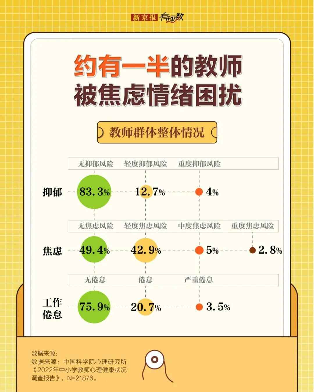 2022年,中国科学院心理研究所一项针对全国2万多名教师的调研结果显示,有一半教师被焦虑情绪困扰,但其中四成多教师是轻度焦虑风险,中度、重度焦虑风险的仅7. 8%。同时,有超过两成的教师存在工作倦怠,3.5%的教师存在严重倦怠。