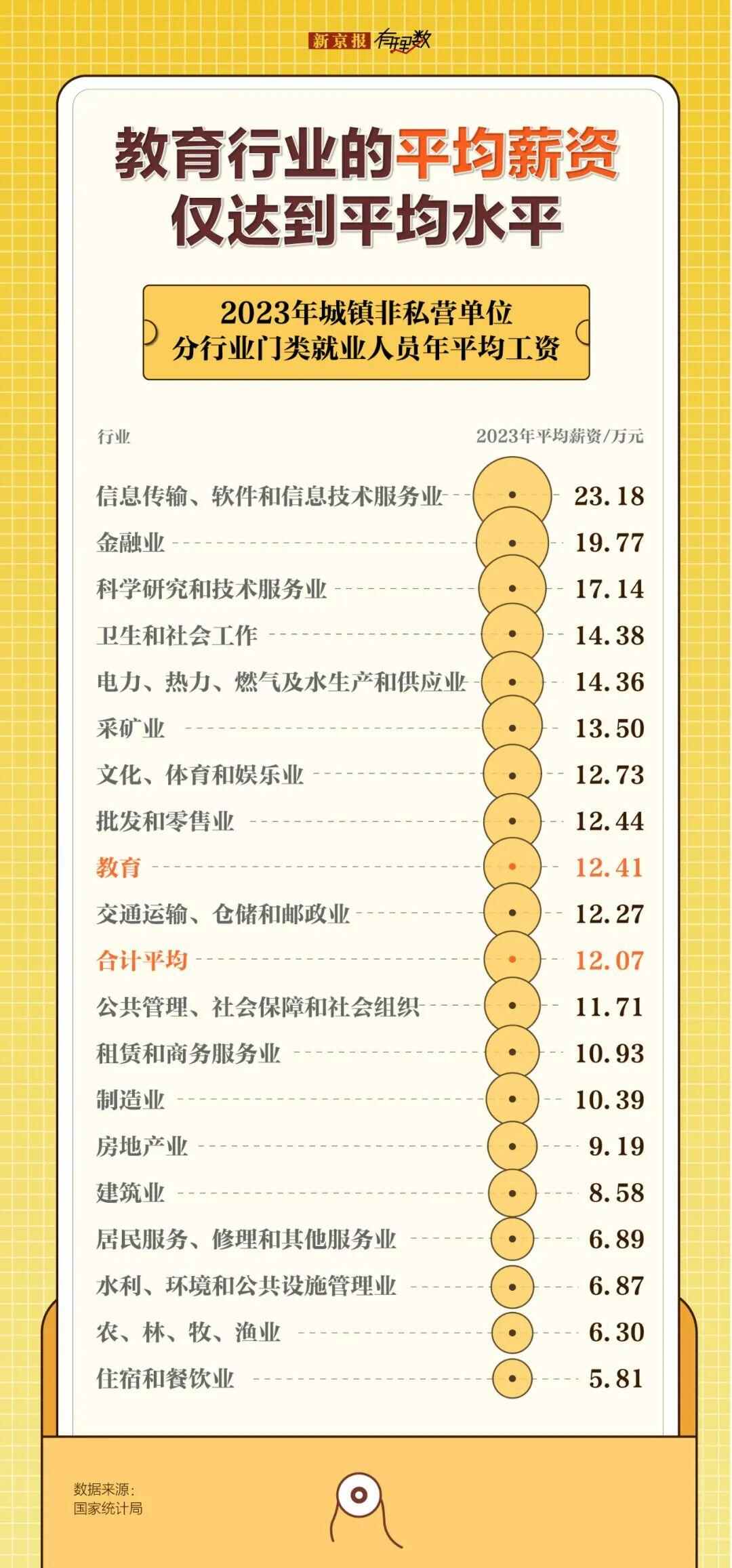 根据2023年国家统计局发布的数据,教育行业的平均薪资在各行业中仅排名第九,刚达到薪资平均水平。