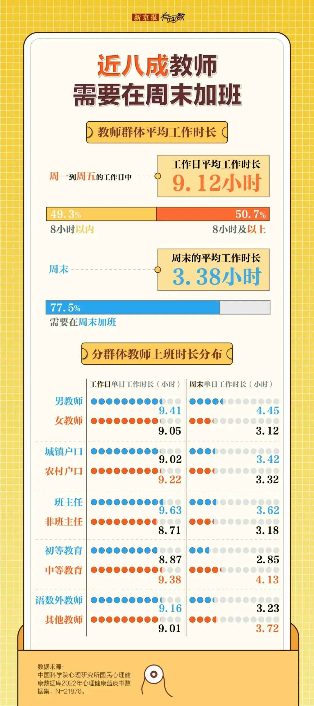 《2022年中小学教师心理健康状况调查报告》显示,我国中小学教师每周的平均工作时长为52.36小时,超出法定工作时间12.36小时。当前教师在课后服务、 作业设计和管理、作业批改、学业辅导以及家校沟通等方面的工作量加大,尤其是班主任教师,工作日每日的工作时长接近10小时。