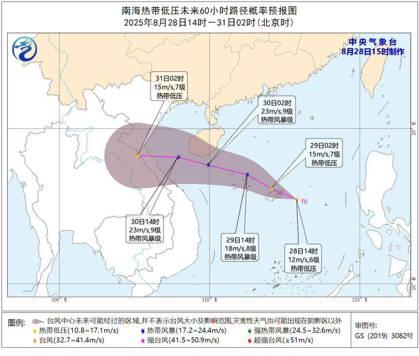 未来,南海热带低压整体呈西北行路径。中国天气网首席气象分析师信欣介绍,该低压或于30日早晨从海南南部近海掠过,30日夜间可能登陆越南,总体路径类似之前的台风“剑鱼”,但强度明显弱于“剑鱼”。