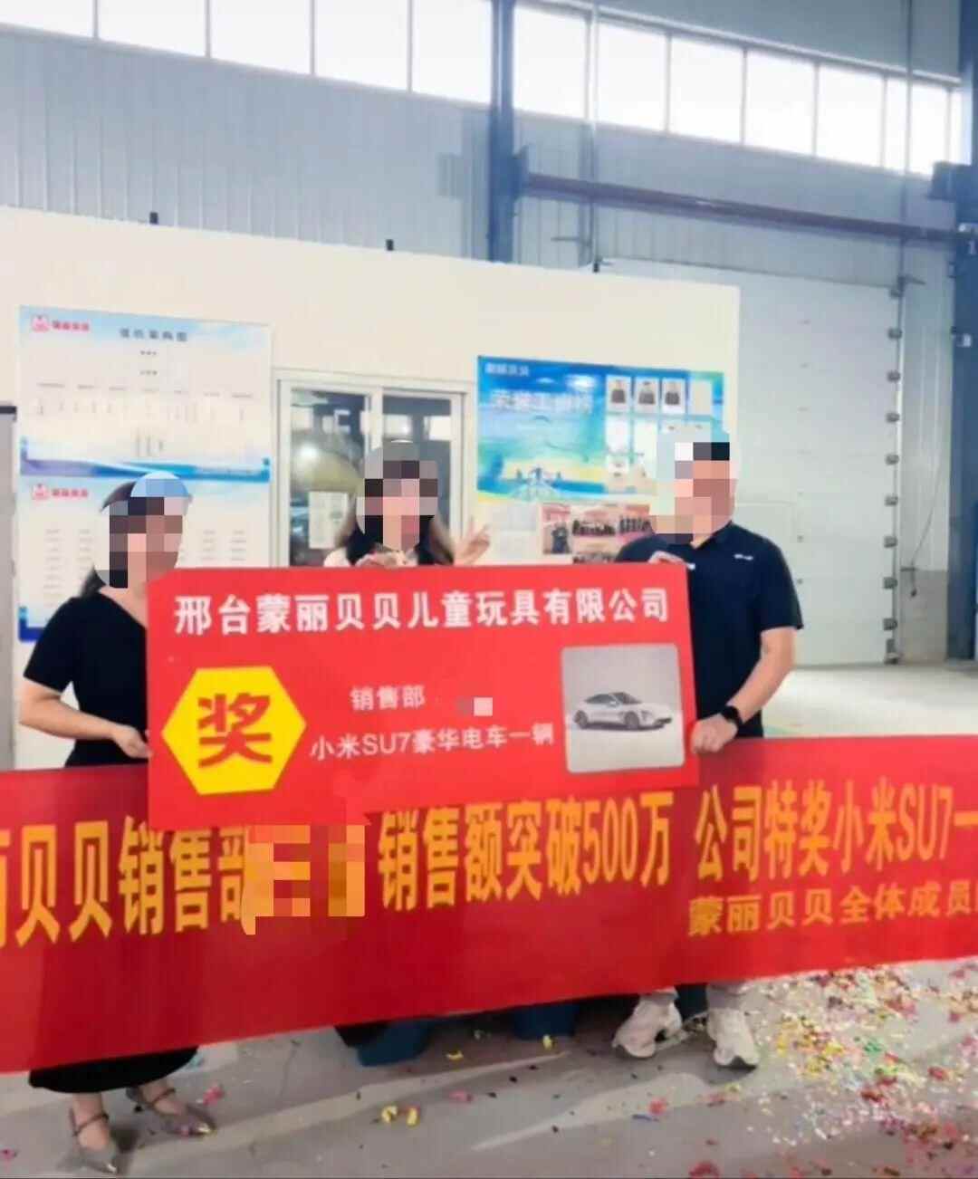 8月23日,网友发布视频,河北邢台蒙丽贝贝儿童玩具公司一名销售额达500万元的销售人员获赠公司奖励的一辆小米SU7,价值24万元左右。27日,该公司老板吕先生告诉极目新闻记者,获奖员工是一名“00后”,销售额达到了500万元后公司奖励其一辆车。吕先生称,若有员工销售额达到1000万,将获赠一套价值50万元左右的房子,奖品均可折现。