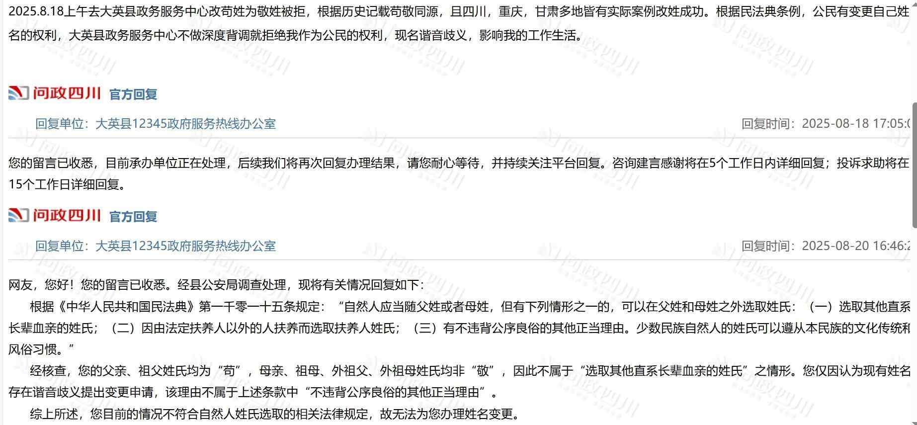 8月18日,四川遂宁大英县一位苟姓市民在问政四川投诉称,由于“现名谐音歧义,影响工作生活”,她希望将苟姓改为敬姓,但是未能成功。