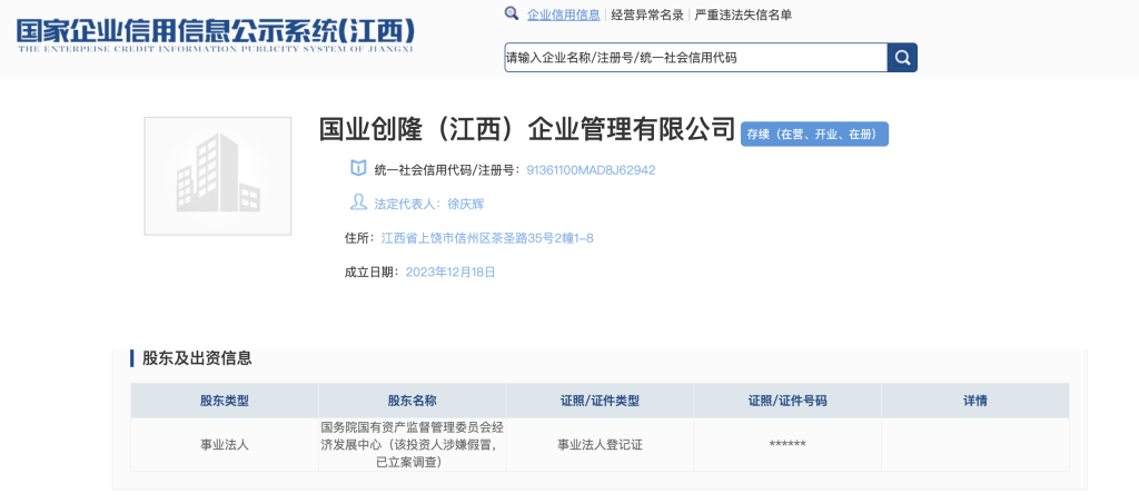 8月22日,澎湃新闻致电国业创隆(江西)企业管理有限公司登记机关江西上饶市市场监管局,相关工作人员表示,此前已向国务院国资委产权管理局发函咨询,回函“国务院国有资产监督管理委员会经济发展中心”并不存在,目前正通过相关程序撤销其虚假登记。