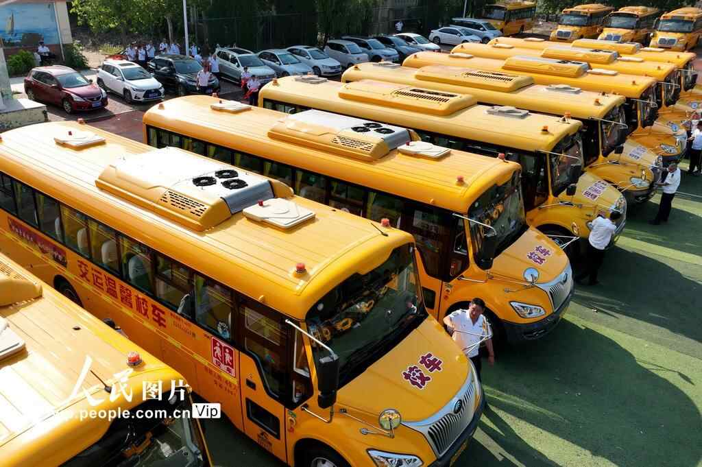 开学季临近,山东省青岛市城阳区上马交管中队的民警走进街道教育服务中心,对中心内的20余辆校车进行安全“体检”,消除各种隐患,确保新学期学生乘车安全。王海滨摄(人民图片网)