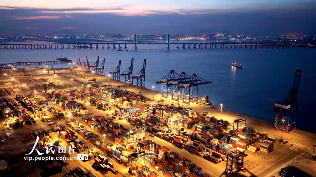 2025年8月22日,福建泉州港石湖港区集装箱码头灯火通明,货轮装卸、桥吊运转、车辆穿梭,一片繁忙的生产景象。王旺旺摄(人民图片网)