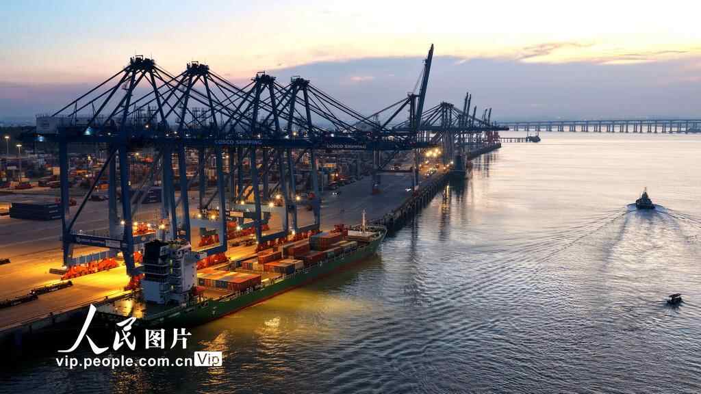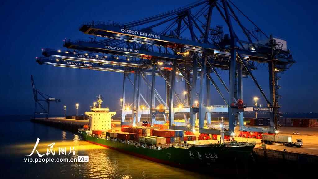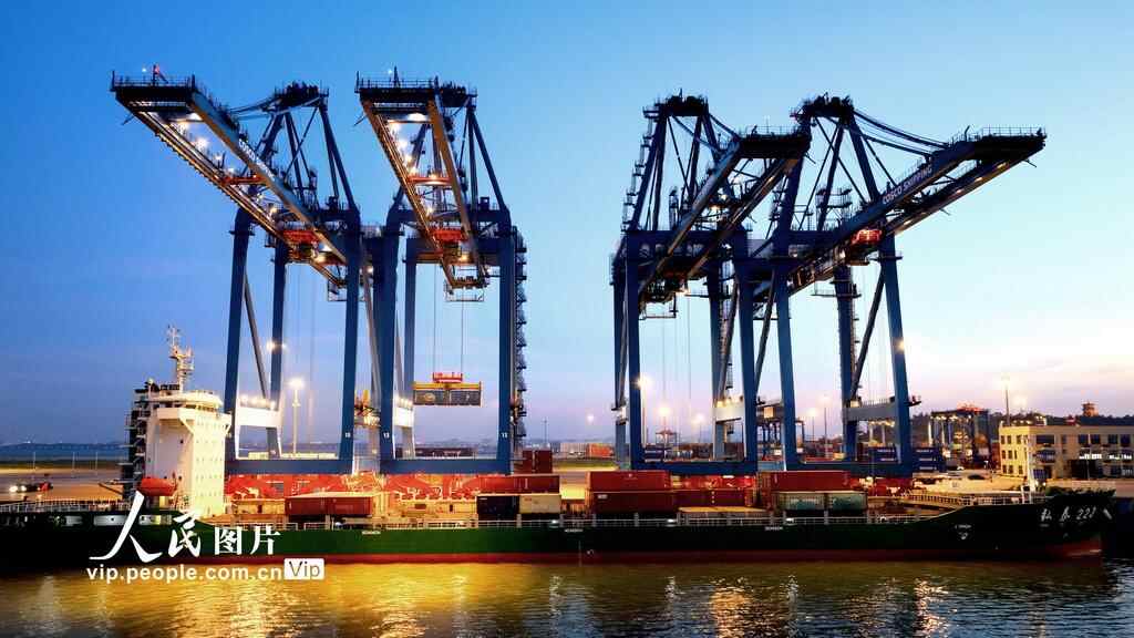 2025年8月22日,福建泉州港石湖港区集装箱码头灯火通明,货轮装卸、桥吊运转、车辆穿梭,一片繁忙的生产景象。王旺旺摄(人民图片网)