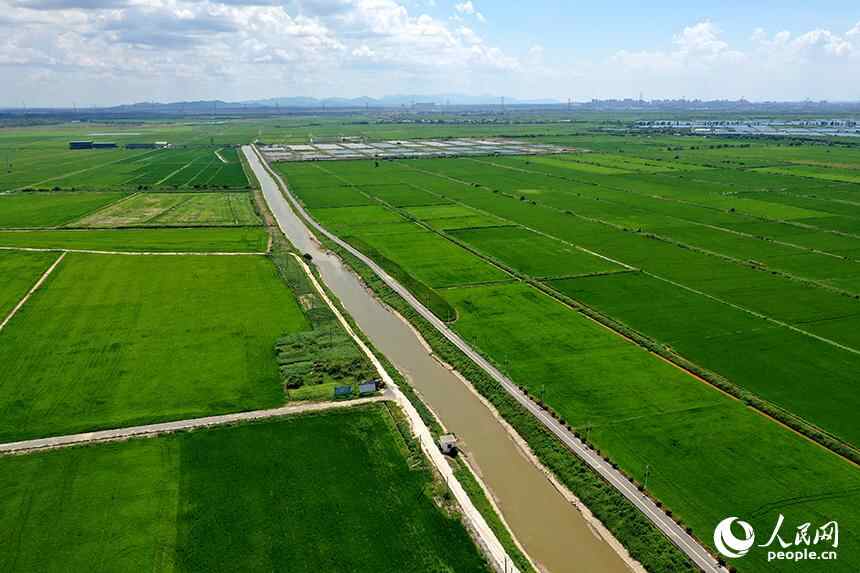 江西省永修县三角乡,“稻虾连作”的沃野上,连片中稻在微风中泛起层层碧浪,宛如绿色海洋。人民网记者 时雨摄