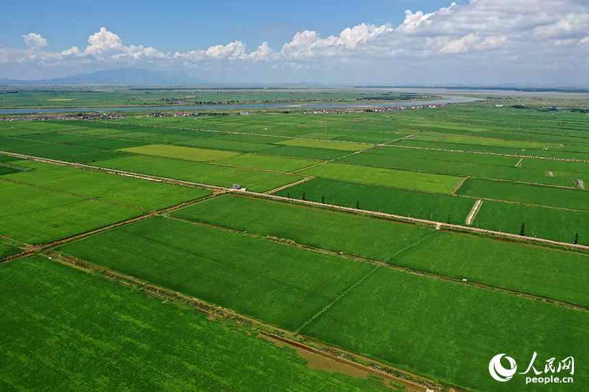 江西省永修县三角乡,“稻虾连作”的沃野上,连片中稻在微风中泛起层层碧浪,宛如绿色海洋。人民网记者 时雨摄