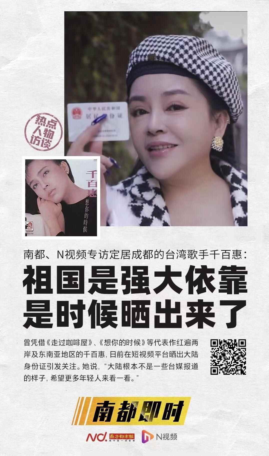 2021年11月27日,时年58岁的她在抖音发布了一则短视频,晒出自己的大陆居民身份证。随后,“台湾歌手千百惠定居成都”的新闻曾冲上热搜第一,引发网友广泛关注。