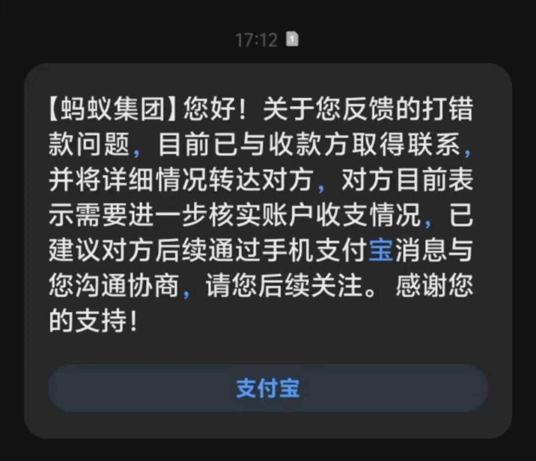 当日下午,支付宝官方客服反馈,目前已联系上收款方,“对方目前表示需要进一步核实账户收支情况,已建议对方后续通过手机支付宝消息与您沟通协商。”
