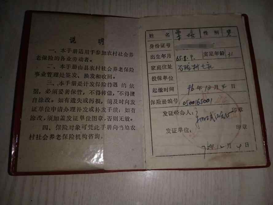 记者注意到,粟培当时的缴费收据单为《长宁县农村社会养老保险基金缴款收据》,收款时间是1996年12月4日,金额200元。收据上加盖的是长宁县人民政府梅硐镇人民政府公章,并发放了《农村社会养老保险手册》,封面显示,该手册由长宁县农村社会养老保险事业管理处颁发,但首页加盖的是长宁县民政局公章,首页还特别说明“本手册是计发保险待遇的依据”。缴费记录注明:“一次性缴纳200元。”