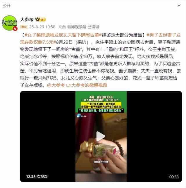 近日,家住平顶山的老史因病去世后,妻子整理遗物发现他留下了一间房的“古董”。其中有十斤重的“和田玉”籽料,“帝王生肖玉玺”,”绝版纪念币”等,按照标价估值近10万。家人拿去鉴定发现,绝大多数都是赝品,实际价值不到十分之一。原来这些“古董”都是老史听人推荐购买的,为了买这些古董,平时省吃俭用,即使生病住院也舍不得花钱。妻子崩溃:丈夫一直说有钱,去银行一查只剩7块5。女儿又心疼又生气:父亲心是好的,花光一辈子积蓄就想给子女存点钱。