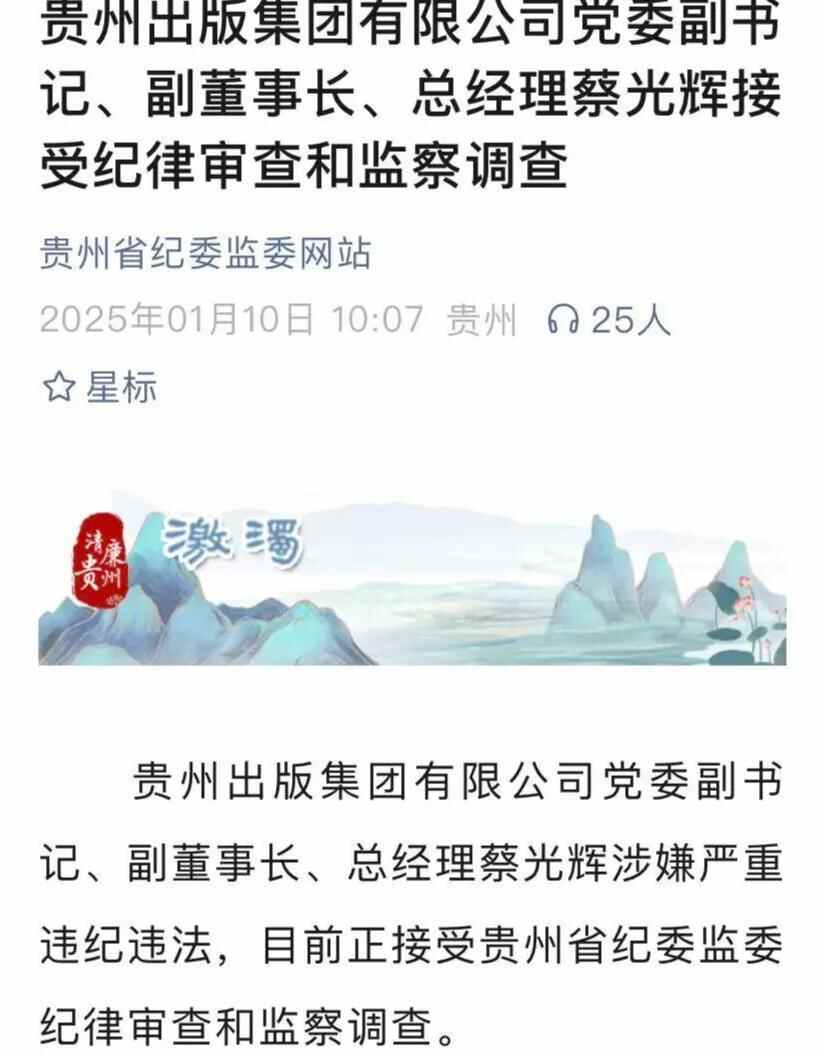 巧的是,半年前的2025年1月10日,贵州省纪委监委发布消息显示,也有名为蔡光辉的厅官落马。通报称,“贵州出版集团有限公司党委副书记、副董事长、总经理蔡光辉涉嫌严重违纪违法,目前正接受贵州省纪委监委纪律审查和监察调查。”