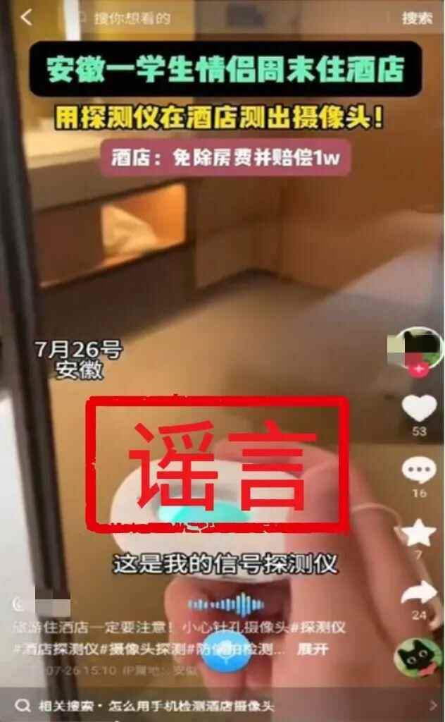 近日,蚌埠公安网安部门查明,刘某某为活跃账号,吸粉引流,在某短视频平台发布“安徽一学生情侣周末住酒店用探测仪在酒店测出摄像头并报警处理,酒店回应:免除房费并赔偿1万元”的不实言论,公安机关依法对刘某某予以行政处罚。
