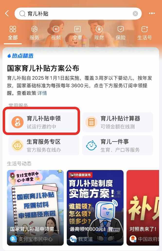 有的用户上支付宝搜“育儿补贴”,点击育儿补贴申领入口,完成了申领资料提交。