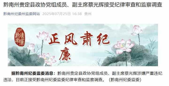 2025年7月25日,贵州省黔南州纪委监委发布消息称,黔南州贵定县政协党组成员、副主席蔡光辉涉嫌严重违纪违法,目前正接受黔南州纪委监委纪律审查和监察调查。