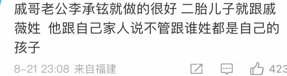 戚薇丈夫李承铉在节目中透露,自己和戚薇在生一胎时就商量好,一胎跟爸爸姓,二胎跟妈妈姓。此举也被网友纷纷点赞。