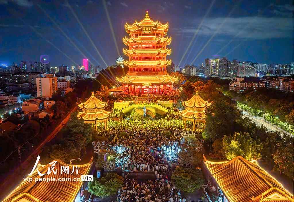 2025年8月20日晚,湖北武汉黄鹤楼景区《夜上黄鹤楼》沉浸式演出吸引大量游客前往游玩。薛婷摄(人民图片网)