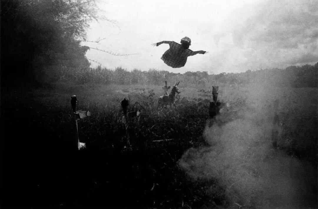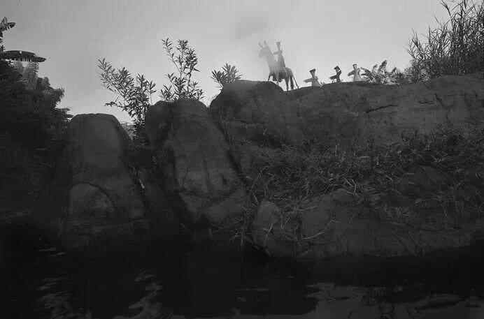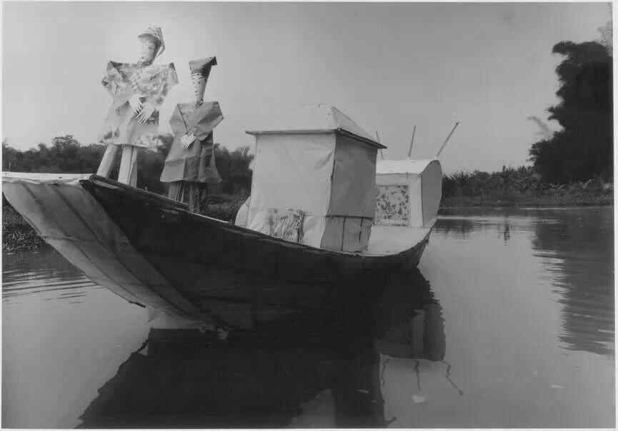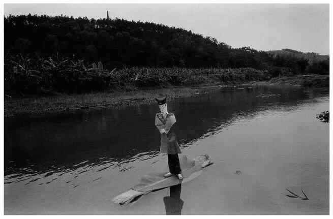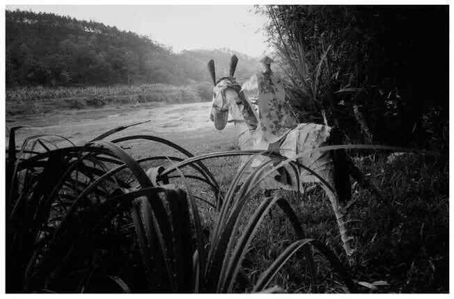 纸人的脸上,都隐隐有一种肃杀的气氛。在关塘的首次拍摄里,我把纸人置于水边,拍摄时,一阵风吹倒了一个“少女”,持镰刀的卢光全正过河走向对岸,去给我砍根蕉叶作道具。