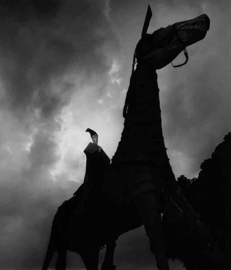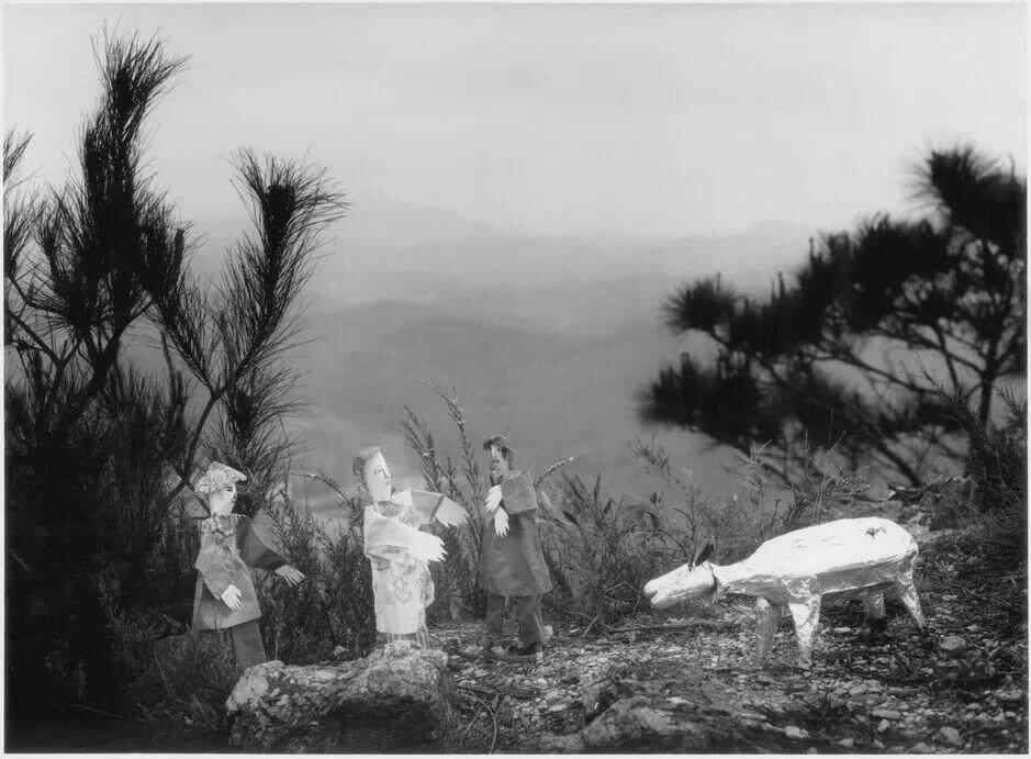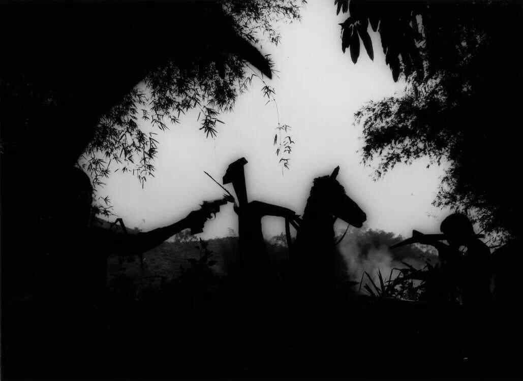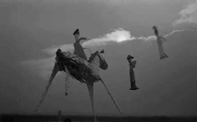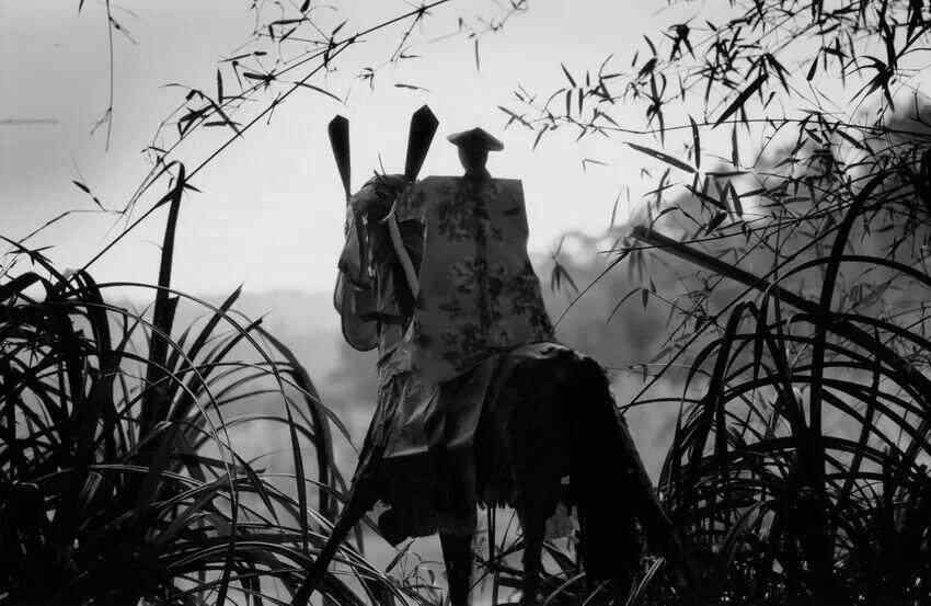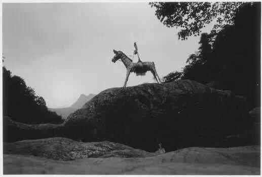 我已隐隐约约感到,我要塑造一个想象中的平静的世界。我和朋友彭坤、老杨开了部车上了城外笔架山。我独自来到山脊,四周山风阵阵,我把一队纸人纸马摆在地上,长久地注视和拍摄他们。我感到从未有过这么亲近的一群朋友。在山风中,我感到久违的平静,和幸福。只是我们在对话,不需要话的对话。