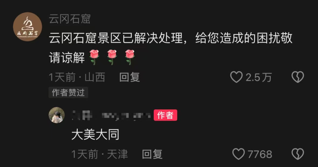 次日,景区认证账号在相关视频下方评论:“云冈石窟景区已解决处理,给您造成的困扰敬请谅解。”