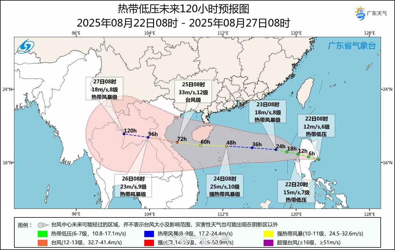 根据广东省气象部门8月22日研判,受到22日早晨在菲律宾东部近海生成的热带低压,及其后期进入南海后可能加强为今年第13号台风的影响,广东海面风力预计将在23日起加大,24日起广东局地逐渐转雨。由于正值暑期旅游旺季,气象部门提醒广东各地做好防御工作,特别是滨海旅游、海上作业和海面过往船只等的防风工作。