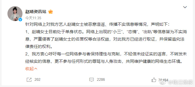 微博@赵晴资讯站回应:赵晴女士目前处于单身状态。网络上出现的“小三”“恋情”“出轨”等信息皆为不实消息,对于不实信息已经进行取证,并保留追究法律责任的权利。