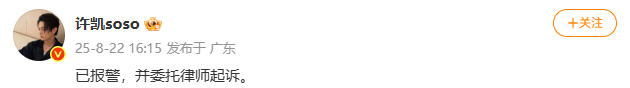 22日下午16时15分,许凯在社交平台发布律师函,并表示:“已报警,并委托律师起诉。 ”