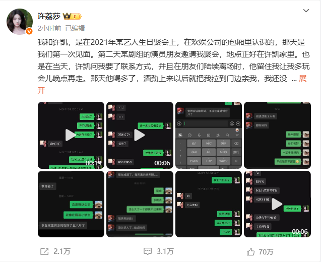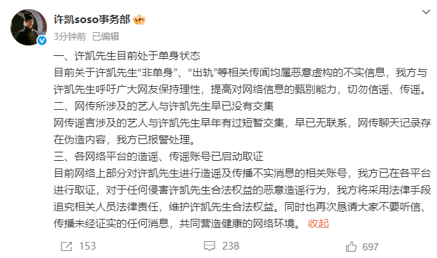 8月22日,许凯工作室打假网传聊天记录,称:“假!!!已报警!!! ”