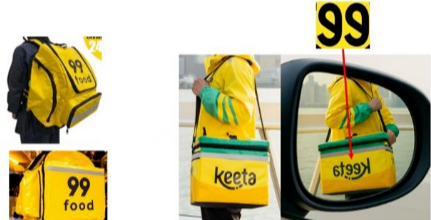 根据诉状中陈列的具体证据显示,除了Keeta选用和99Food一样的黄色作为企业主要标志颜色之外,通过车辆后视镜观看时,Keeta商标字母中间的“ee”两个字母,与99Food商标中的“99”非常相似。