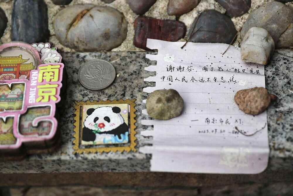 “拉贝虽身居异邦,常怀悲悯,视中国人民若同胞。”一名中国留学生在墓碑前留下这样一张卡片,表达心中的敬意。
