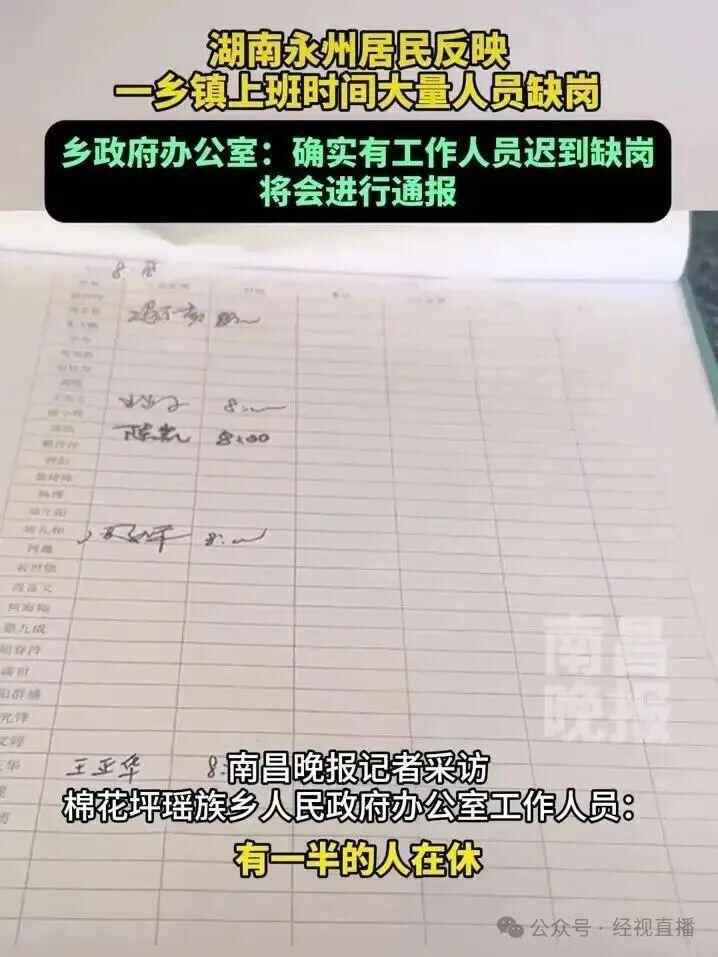 8月18日上午,湖南省永州市宁远县居民反映,前往棉花坪瑶族乡人民政府办事,但上班时间大量乡政府工作人员缺岗、迟到,影响居民办理业务。