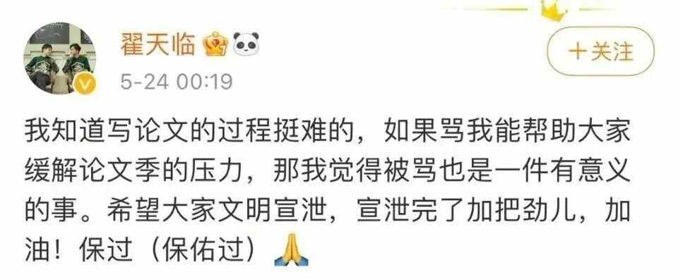 随后,每到毕业季、论文季,网络社交平台都会出现一波“声讨”翟天临的声音。2021年5月,翟天临发文回应:“我知道写论文的过程挺难的,如果骂我能帮助大家缓解论文季的压力,那我觉得被骂也是一件有意义的事。希望大家文明宣泄,宣泄完了加把劲儿,加油!保过(保佑过)。”