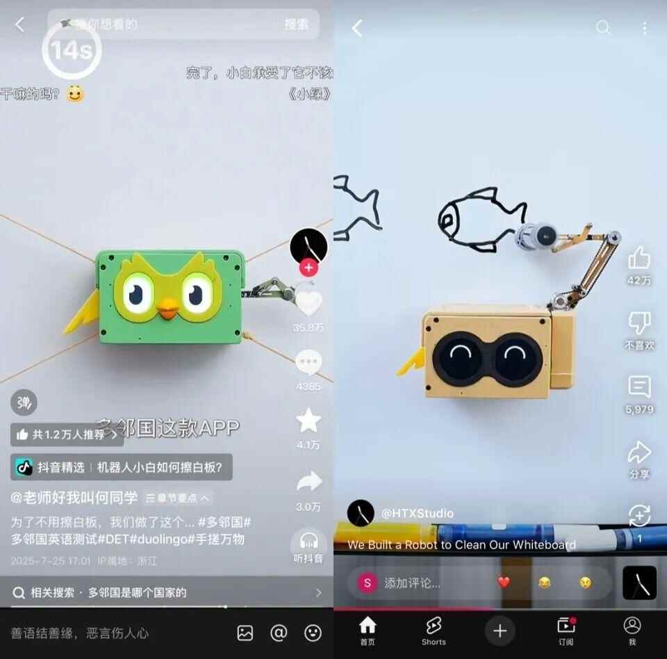 而HTX Studio在海外发布的对应视频均删去了品牌植入内容。例如,智能垃圾桶、智能黑板擦的海外版视频分别删去了海尔洗烘套装广告、多邻国植入广告。
