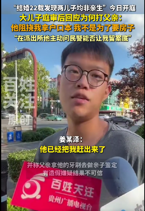 庭审结束后,案件中的“长子”姜某泽在庭外接受了媒体采访,首度公开回应了此前备受争议的“长子回应殴打父亲”事件。他对此给出了截然不同的解释,称冲突根源并非家庭恩怨,而是姜洪涛拒绝提供户口本以阻碍其办理个人事务。