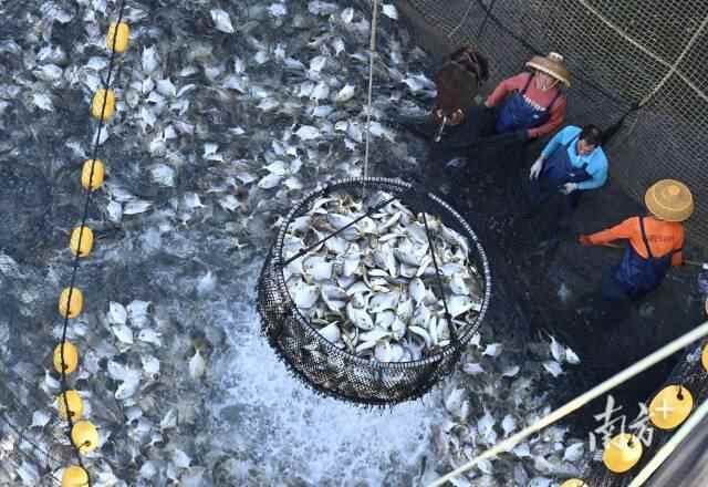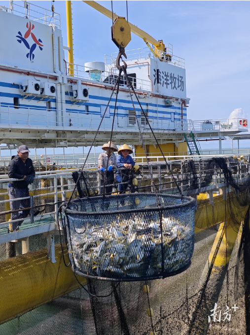 “海威2号”迎来首批“住户”,约100万尾、20多万斤的金鲳鱼苗以及部分鳘鱼、军曹鱼被投入网箱。南方+记者 张令 摄