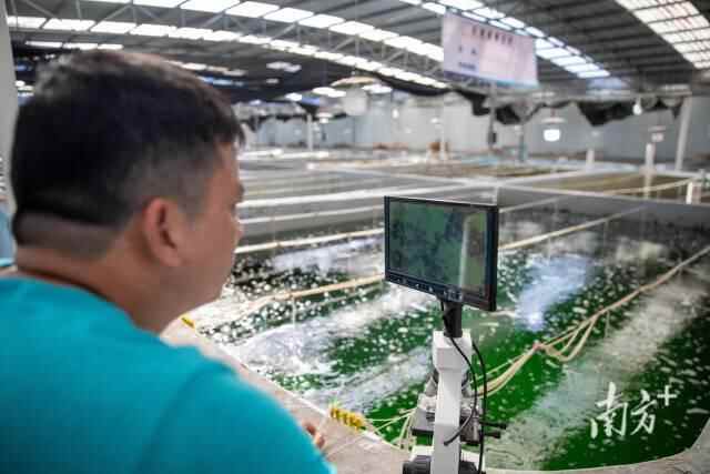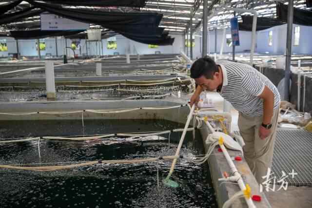 在阳江市阳西县的种苗繁育基地,工作人员观测鱼苗生长情况。南方+记者 张令 摄