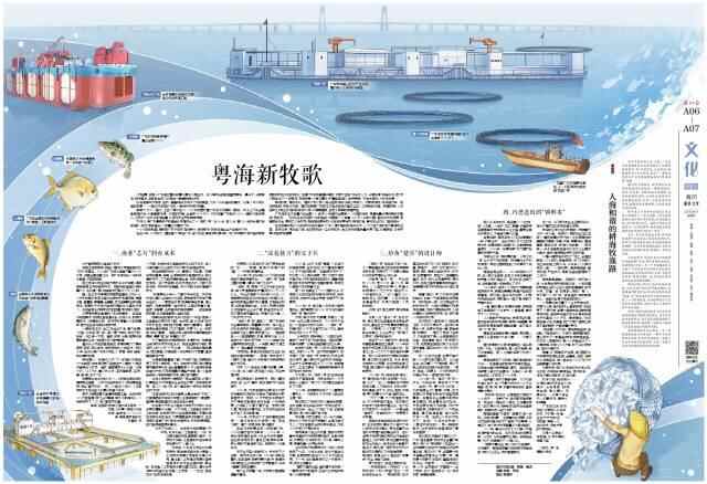 在科研工作者的不懈努力下,广东“蓝色基建”的科技含金量不断提升,现代化“耕海舰队”日益壮大:全球首艘水体自然交换型深远海养殖工船“湾区伶仃”号,全国最大的风渔融合养殖平台“伏羲一号”,粤东最大支腿式(桁架式)重型海洋牧场平台“龙宫号”……从科研到应用,众多“全球首创”“中国第一”,合力筑牢、壮大“蓝色粮仓”,让“海洋牧歌”愈唱愈响亮。