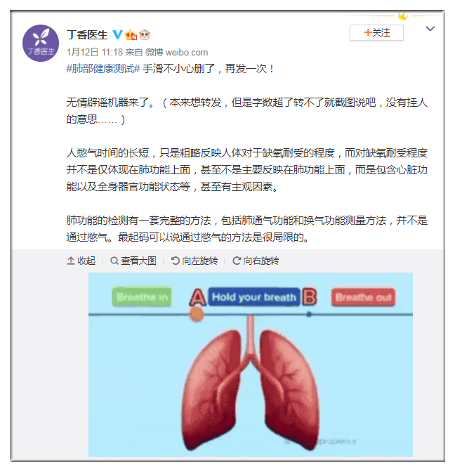 所以,仅仅用憋气的方法也来说肺是否健康,显然是不科学的。@丁香医生 也曾对此进行了辟谣: