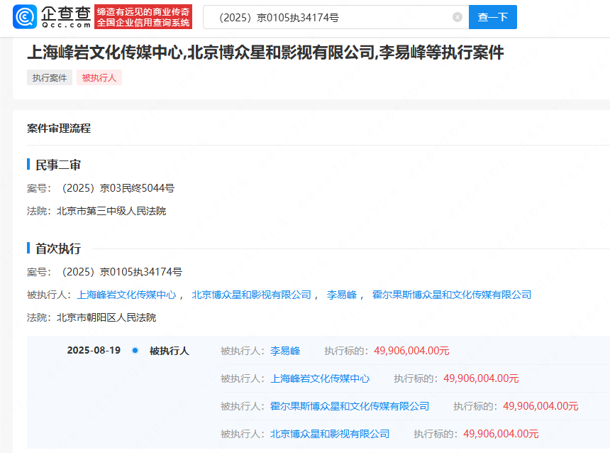 8月21日,记者从企查查获悉,近日,李易峰、上海峰岩文化传媒中心、北京博众星和影视有限公司等被北京市朝阳区人民法院强制执行约4990万元。其中,上海峰岩文化传媒中心成立于2018年,由李易峰个人出资。