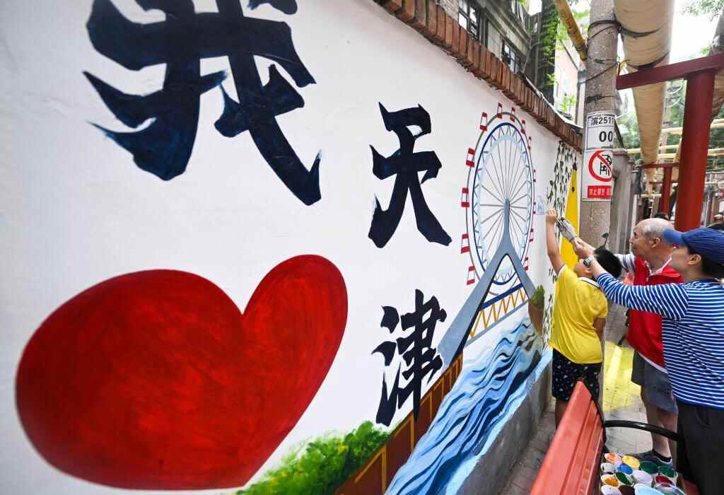 8月15日,在天津市和平区劝业场街道兆丰路社区,志愿者和社区居民对一处胡同的老旧墙体进行彩绘美化。新华社记者 赵子硕 摄