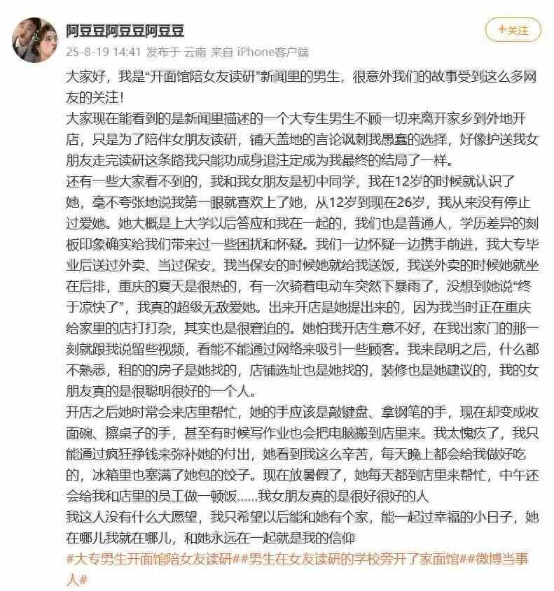 大家好,我是“开面馆陪女友读研”新闻里的男生,很意外我们的故事受到这么多网友的关注!