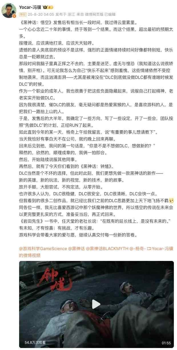 随后,游戏科学创始人、CEO,《黑神话:悟空》制作人冯骥发文解释为何推出新作。他表示,《黑神话:悟空》发售后有相当长一段时间,他过得云里雾里。DLC当然是个不坏的选择,但此时此刻,他们更想先做一款黑神话的新作——新的英雄,新的玩法,新的视觉,新的技术,新的故事。他补充说,“悟空的传说在未来会以更完整更扎实的方式,准备妥当后,再正式回来。”