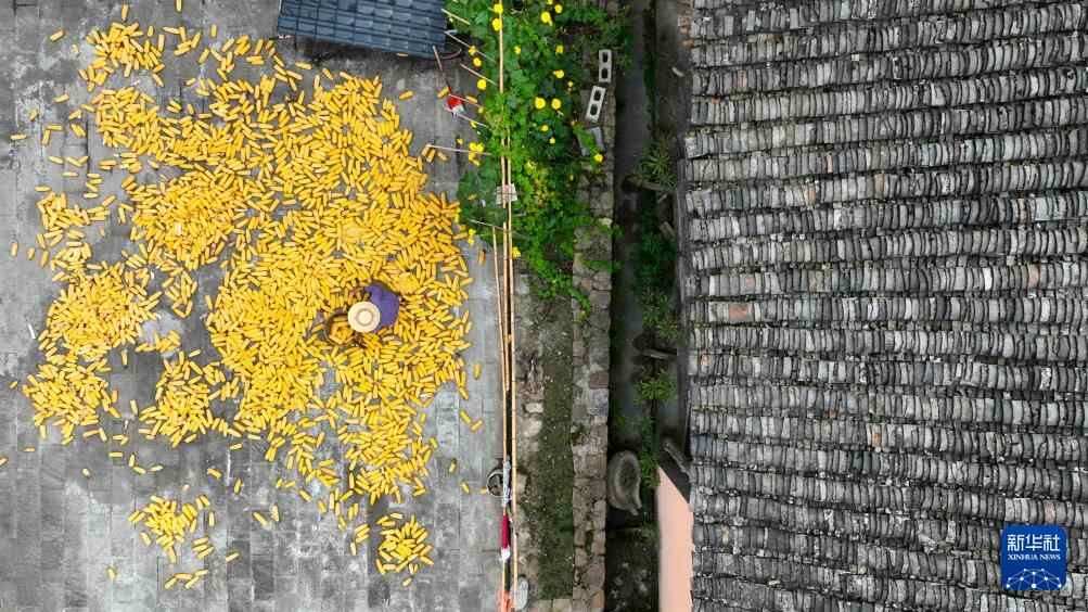 8月18日,猛董村村民在晾晒玉米(无人机照片)。