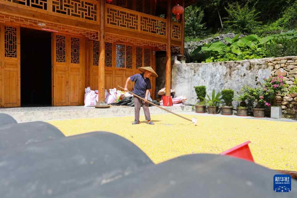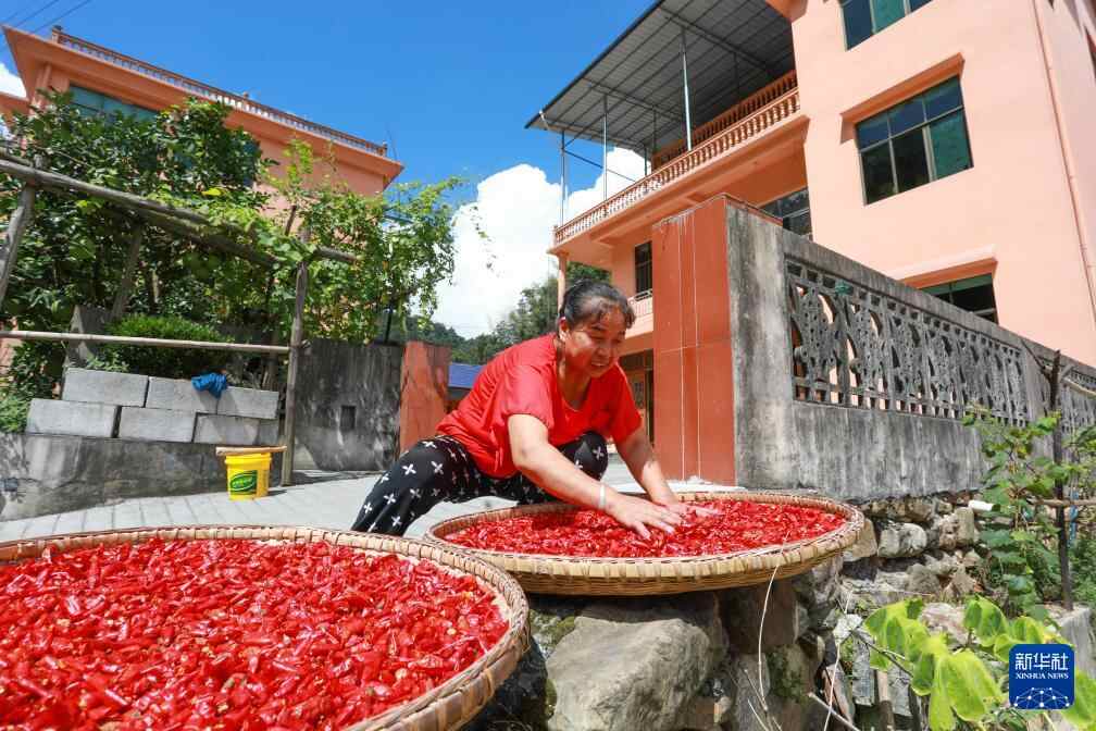 近日,重庆市秀山县洪安镇猛董村村民抢抓晴好天气,在房前屋后忙着晾晒玉米、水稻、辣椒等农作物。