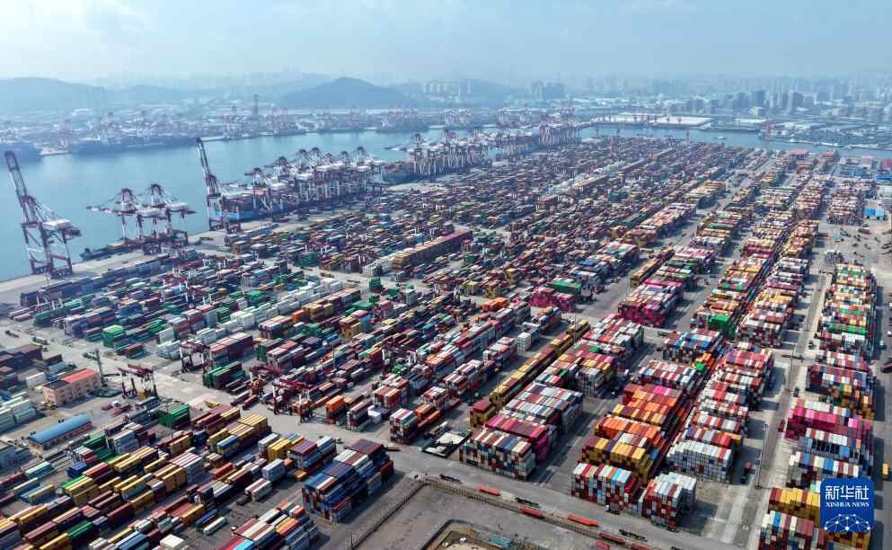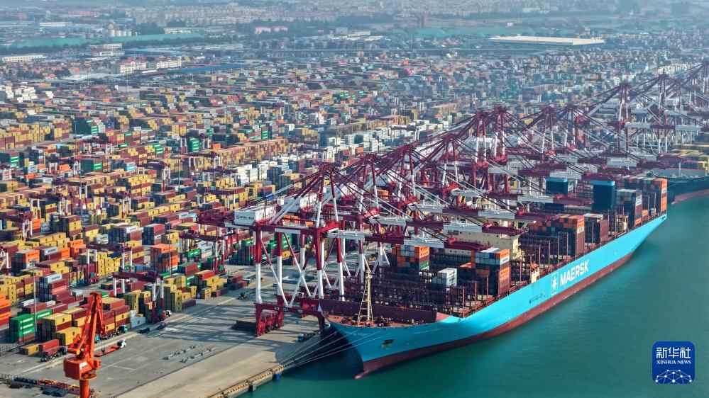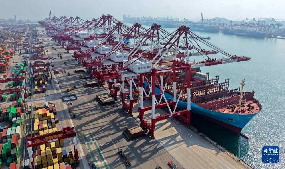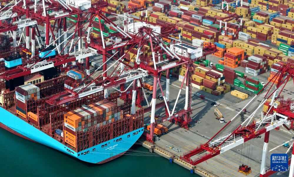 8月19日,一艘货轮在山东港口青岛港前湾港区装卸集装箱(无人机照片)。