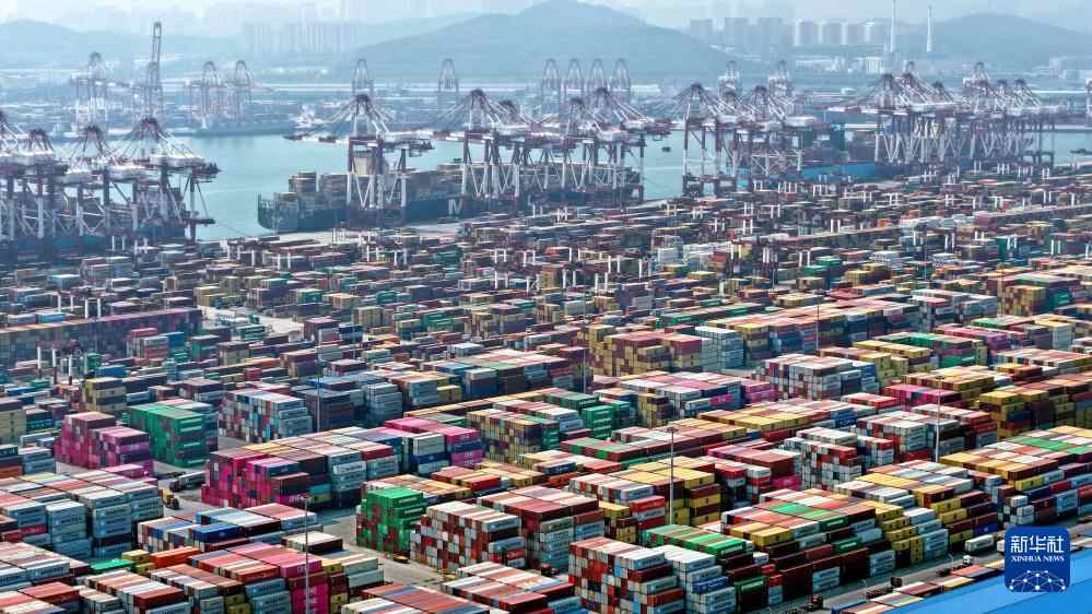 8月19日,货轮在山东港口青岛港前湾港区装卸集装箱(无人机照片)。