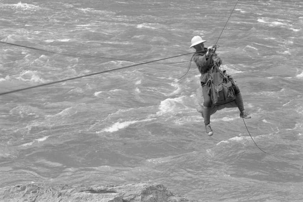 1983年,西藏林业局考察队员通过雅鲁藏布江上的溜索过江。新华社记者 土登 摄
