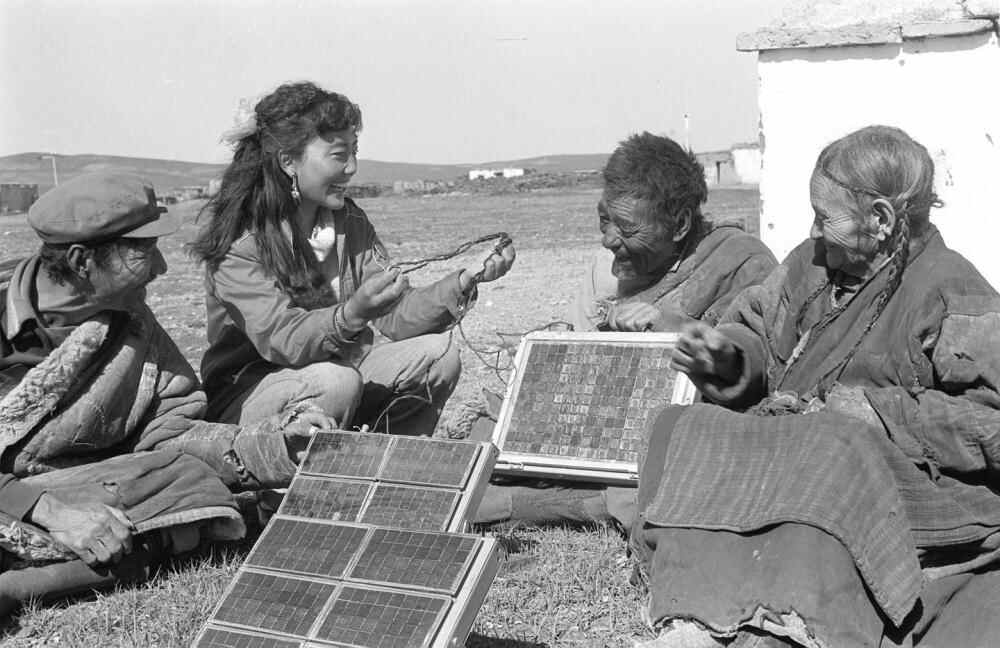 1986年3月,那曲地区(现为那曲市)科委工作人员齐美才央(左二)给牧民讲解太阳能电池使用方法。新华社记者 才龙 摄