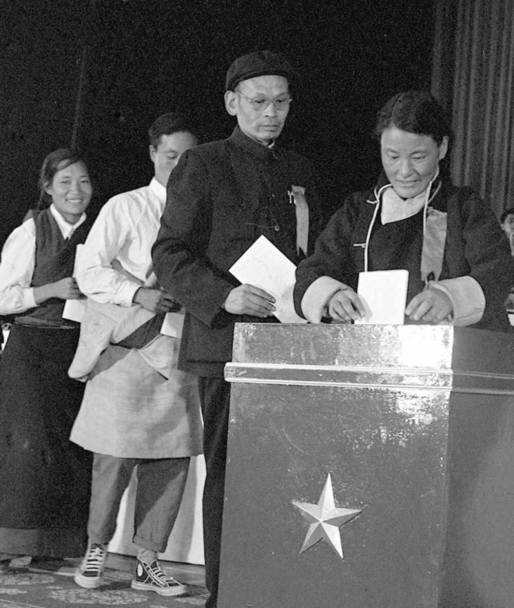 1965年9月,西藏自治区第一届人民代表大会第一次会议的代表次仁拉姆(右一)正在投票。新华社记者 袁克忠 摄